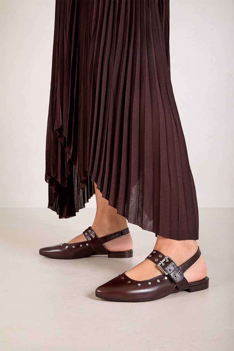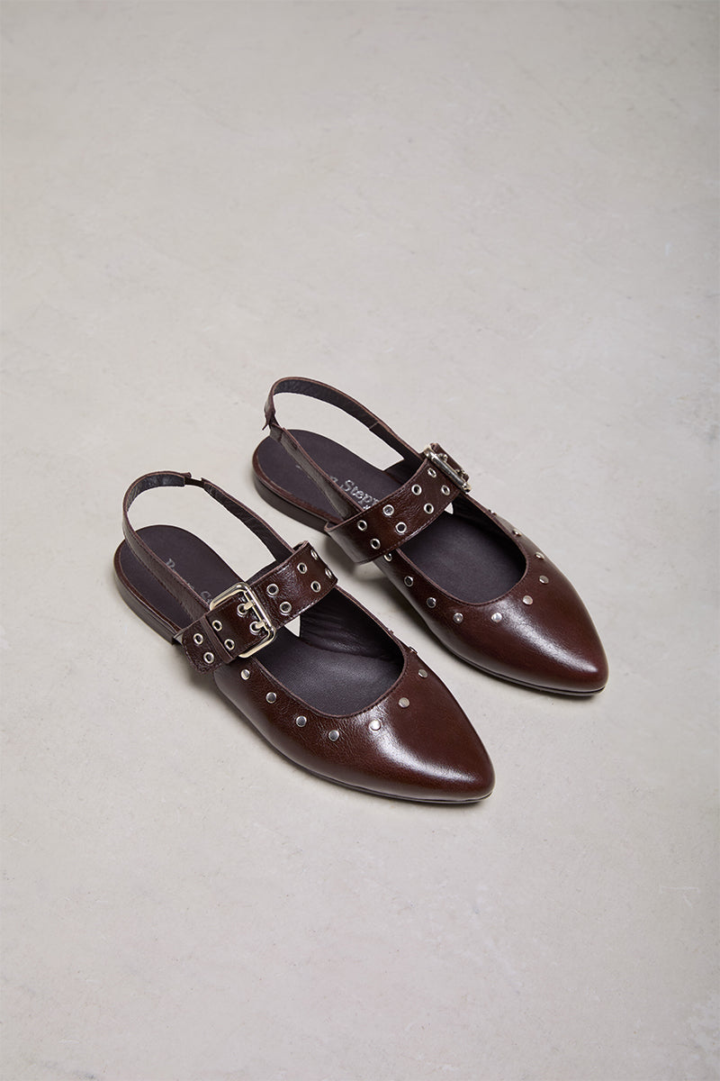 Pointed toe leather ballerina flat with studs and a strap to adjust to the foot.