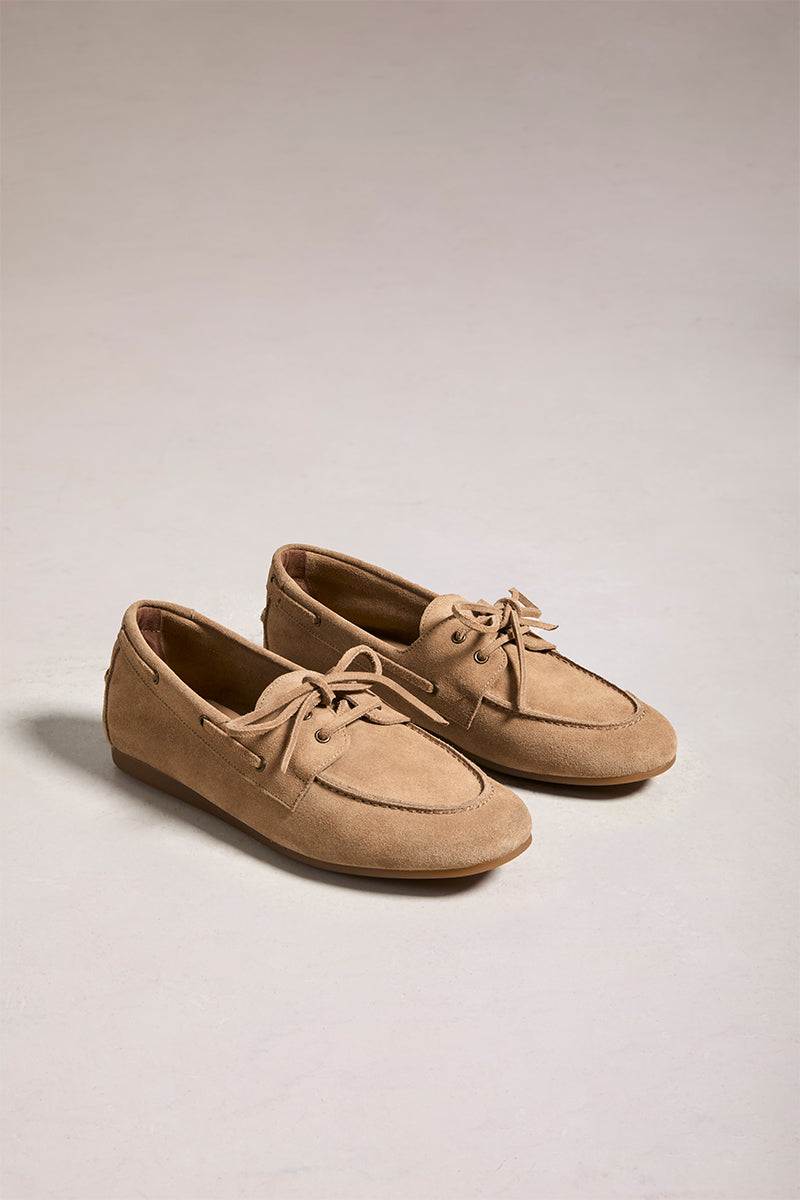 Boat shoes in split leather with flexible sole and wedge in the heel for greater comfort, designed and handcrafted in Spain.