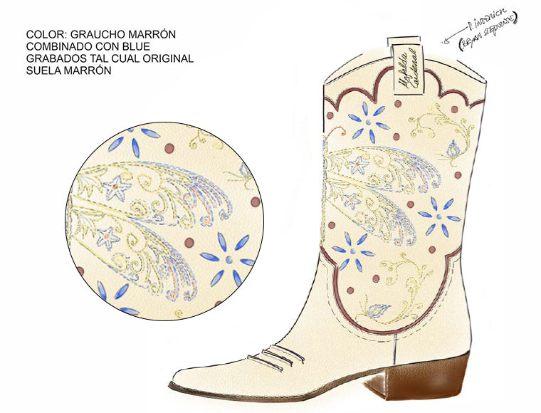 Un diseño que imaginó Mafalda Cardenal y que han hecho realidad nuestros expertos artesanos y artesanas. Estas botas cowboy plasman la identidad de la cantante y su imaginario gracias a los bordados y calados que la cubren de fantasía western.